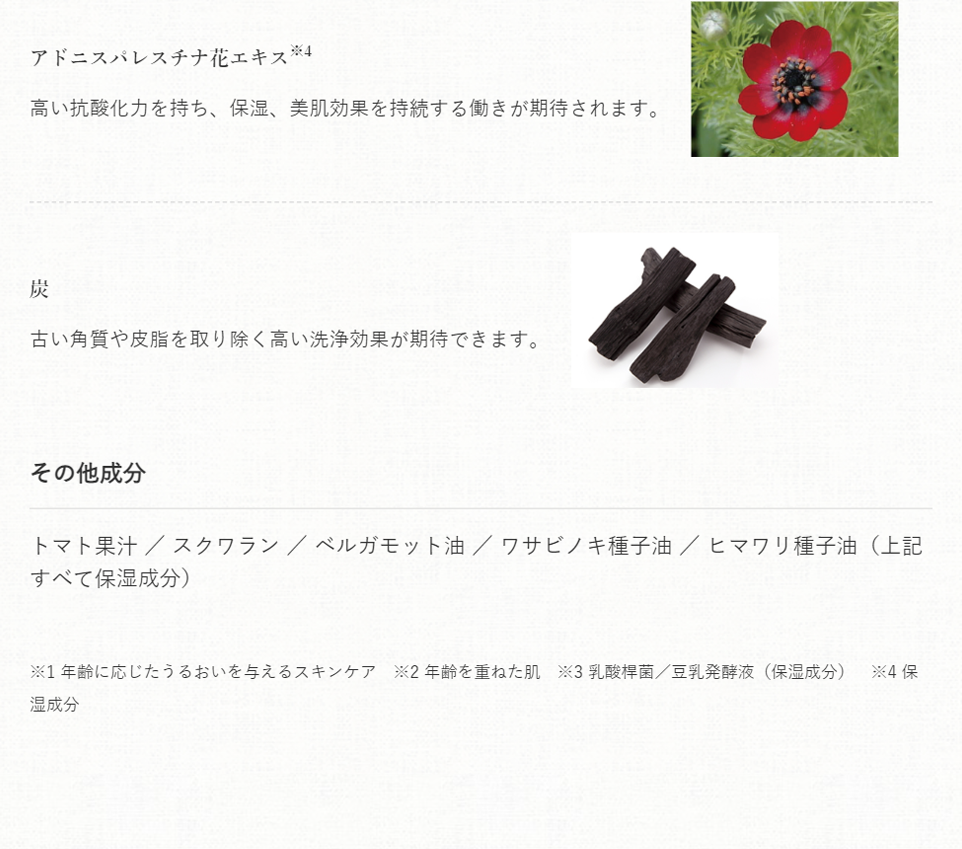カリ含有石ケン素地、水、スクロース、グリセリン、エタノール、ソルビトール、黒砂糖、乳酸桿菌/豆乳発酵液、セラミドAP、セラミドNP、ダイズイソフラボン、ダイズ種子エキス、ダイズ脂質、ヒアルロン酸Na、水溶性コラーゲン、スイゼンジノリ細胞外多糖体、スクワラン、アドニスパレスチナ花エキス、トマト果汁、ベルガモット油、ワサビノキ種子油、ヒマワリ種子油、シルク、炭、レシチン、PEGー60水添ヒマシ油、ポリソルベート80、クエン酸、トコフェロール、酸化鉄